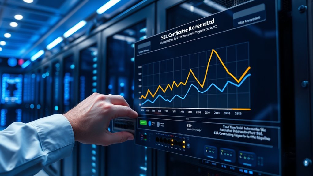 Automated SSL renewal can slightly impact server performance by increasing CPU and memory usage during renewal processes. You might notice a temporary boost in SSL cache activity, but generally, this impact remains minimal. Renewal frequency matters; more frequent renewals can cause more cache updates, affecting performance. However, automation guarantees timely renewals, reducing downtime and maintaining secure connections, making performance disruptions negligible and manageable in your server environment.