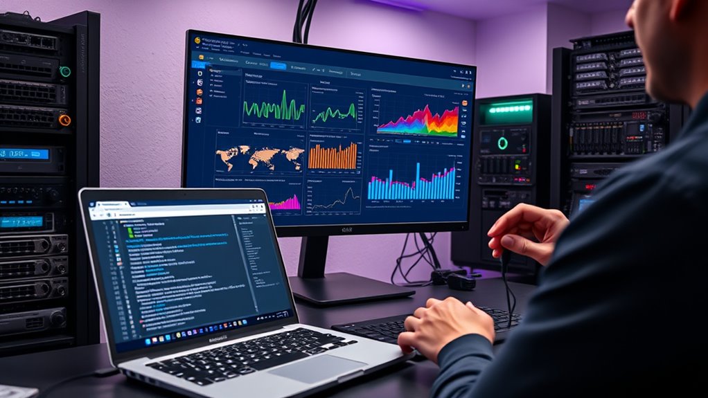 To set up Prometheus and Grafana on your VPS for pro-level monitoring, start by installing Prometheus and configuring custom alert rules for your environment’s metrics. Next, deploy Grafana and connect it to Prometheus as a data source. Customize dashboards to visualize key metrics and incorporate alert notifications through channels like Slack or email. With proper setup, you’ll get real-time insights and alerts. Keep exploring to learn how to optimize your monitoring system further.