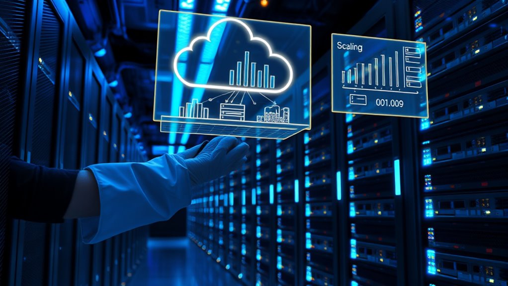 You need to set up automated scaling triggers that respond to real-time traffic changes, so your system adjusts resources promptly. By monitoring traffic patterns continuously, you can make certain your application scales efficiently without manual intervention. This approach keeps your services reliable and responsive, even during sudden traffic spikes. Additionally, incorporating performance metrics allows for more precise adjustments, ensuring optimal resource utilization at all times.
