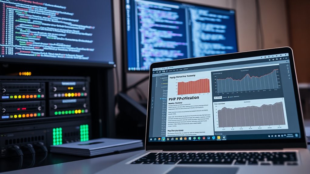 OPcache plays an essential role in boosting PHP performance by caching precompiled bytecode in shared memory. When you enable OPcache, PHP doesn’t need to parse and compile scripts every time they run. Instead, it retrieves the cached bytecode directly from memory, which speeds up execution. This process reduces CPU load and markedly cuts page load times, especially on high-traffic sites. After the first execution, the bytecode remains in cache until invalidated by changes or manual clearance. By storing these intermediate code representations, OPcache allows PHP to skip resource-intensive parsing stages, resulting in faster response times. Monitoring its hit rate helps guarantee most requests are served from cache, maximizing performance benefits. Additionally, configuring memory limits appropriately ensures that OPcache can store enough bytecode to handle your application’s needs without eviction. Proper configuration of OPcache settings can further enhance its effectiveness and prevent cache thrashing. Regularly reviewing cache utilization metrics can help identify potential bottlenecks and optimize cache efficiency. Furthermore, understanding the type of applications running on your server can guide you in tuning OPcache settings for optimal performance. Overall, OPcache is a critical tool for optimizing PHP speed and server efficiency.