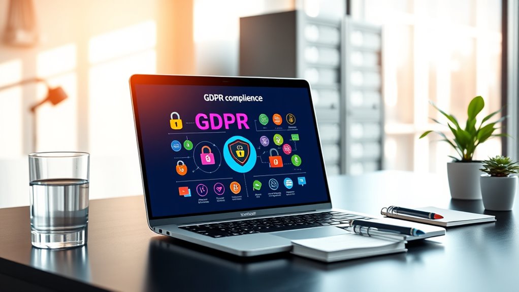 If you don’t comply with GDPR, you risk hefty penalties, including fines up to 20 million euros or 4% of your annual turnover. Non-compliance can also lead to legal actions and damage to your reputation. To avoid this, guarantee you implement data encryption to protect personal data and provide clear privacy notices to inform users about their rights and how you handle their information. Staying proactive keeps you compliant and reduces penalties.