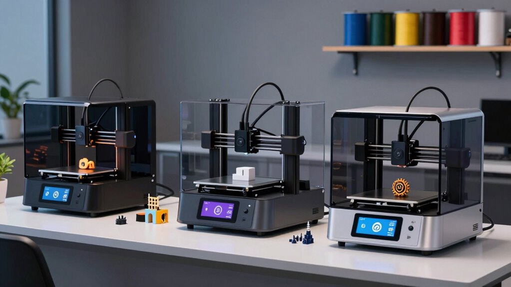 Choosing a 3D printer that’s easy to operate can considerably streamline your small business workflow. An intuitive interface, like touchscreen controls and simple setup steps, helps reduce the learning curve for new users. Automatic features such as auto bed leveling, filament loading, and calibration make operation smoother and minimize manual adjustments. Clear, detailed instructions and user-friendly software are essential for efficient printing and troubleshooting. Opting for pre-assembled or minimally assembled models allows you to start printing quickly without needing extensive technical skills. Built-in safety features, like enclosed designs and odor filters, not only improve usability but also create a safer, cleaner workspace. Prioritizing ease of use ensures your team can focus on producing quality products without unnecessary delays or complications.