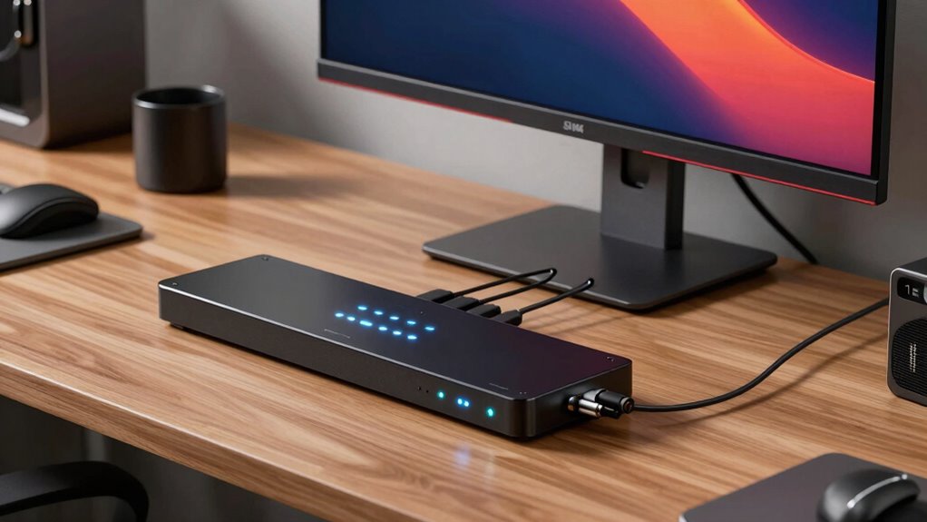 Supporting the right resolutions and refresh rates is vital to getting the most out of your 8K KVM switch. To truly enjoy 8K display quality, the switch should support up to 7680×4320 pixels at 60Hz, ensuring sharp visuals and smooth performance. For gaming or professional editing, higher refresh rates like 60Hz or more are essential for fluid motion. Compatibility with lower resolutions such as 4K@120Hz or 1080p adds versatility across devices. Using HDMI 2.1 or DisplayPort 1.4 standards is essential for maintaining the necessary bandwidth for 8K@60Hz transmission. While higher refresh rates like 120Hz or 144Hz are available, they’re less common at 8K and often require advanced hardware and cables for optimal operation.
