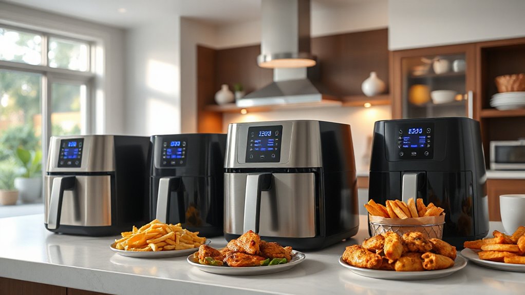 If you’re looking for the best air fryers for large families in 2026, I recommend checking out models like the Chefman TurboFry XL, Nuwave Bravo XL Pro, and Emeril Lagasse’s 26QT French Door Air Fryer Oven. These offer big capacities, versatile functions, and user-friendly features perfect for cooking for many people. Stay with me as I’ll share more details on the top choices and what to weigh when picking the right one for your household.