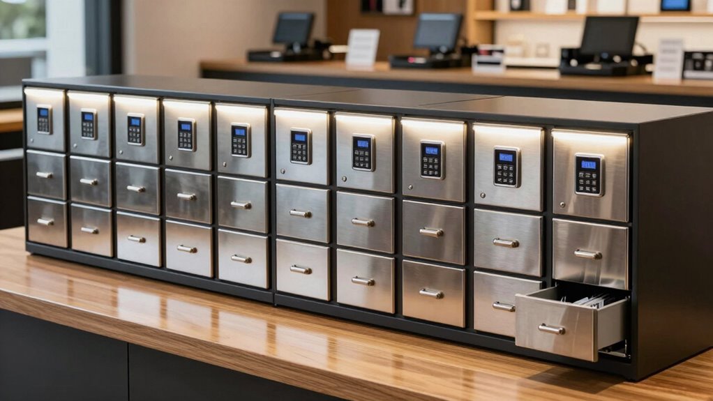 Imagine losing cash because a lock failed during a busy night—I’ve seen this happen. Locking mechanisms vary between models; some use traditional key locks, while others feature electronic or keypad locks for added security. Key locks are simple but can be picked, whereas electronic locks offer convenience and enhanced security. Choosing the right lock depends on your business needs, but always prioritize durability and ease of access for staff.