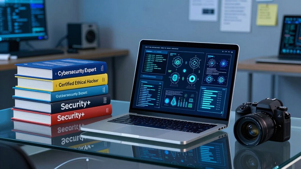 As you set out on your cybersecurity certification journey, imagine holding a sturdy compass in a stormy sea—guiding you safely through complex threats and challenges. These books are your navigational tools, lighting the way amidst the chaos of cyber threats. With dedication and the right resources, you’ll confidently steer toward success, emerging stronger and more prepared than ever. Let these guides be your lighthouse, illuminating your path to a brighter, secure future.