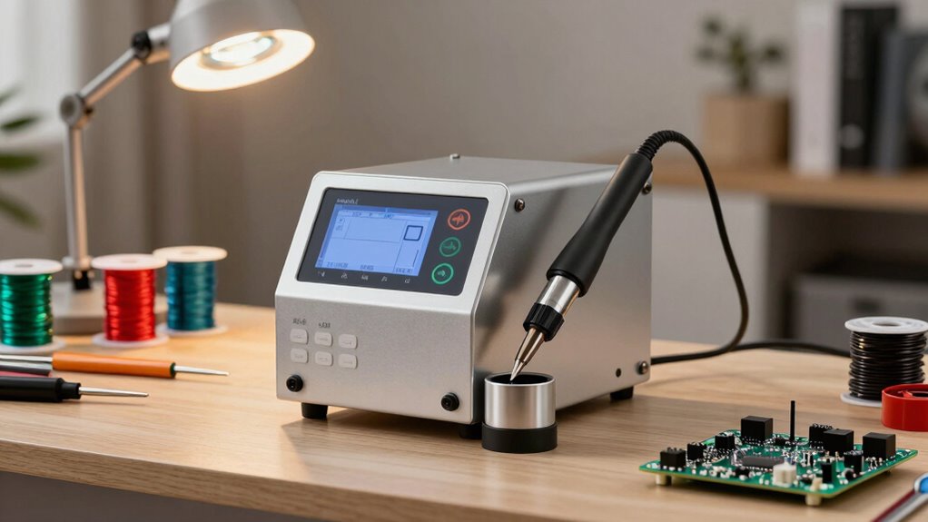 Ever wondered how to guarantee your solder joints stay consistent and your delicate components stay safe? Precise temperature control is key. It ensures you get reliable, strong joints without risking damage. Modern stations use PID technology, which keeps the temperature stable by reducing fluctuations during soldering. Adjustable temperature settings with fine increments let you tailor heat levels for different tasks, from delicate rework to heavy-duty soldering. Digital displays give real-time feedback, so you can monitor and make adjustments easily. High-precision stations often include calibration options, maintaining accuracy over time and across environments. This level of control means better results, fewer reworks, and greater confidence in your work. When choosing a station, prioritize those with advanced temperature management features for the best soldering experience.
