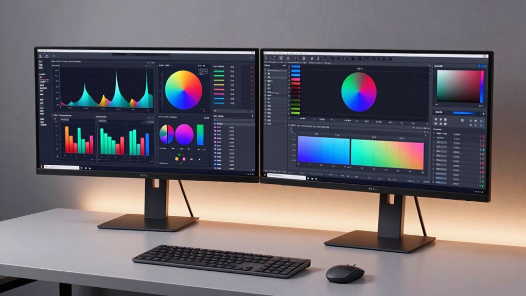 Color accuracy and calibration across monitor models are like different artists’ palettes—some are spot-on, while others need tweaking. High-end models often come factory-calibrated, offering precise color reproduction, perfect for professional work. Lower-end options might need manual calibration for better accuracy. I recommend checking for a monitor’s Delta E value; the lower, the better. Regular calibration guarantees consistent, vibrant colors, especially essential for editing or design work.