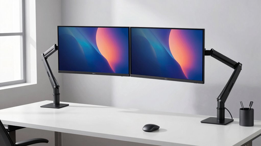 When selecting a heavy-duty dual monitor arm, the mounting options you choose can considerably impact your workspace setup. C-clamp mounts are a popular choice, attaching securely to desk edges from 0.39 to 2 inches thick. Grommet mounts are better suited for thicker desks, supporting thicknesses up to 3.54 inches, but require a pre-drilled hole. Wall mounts offer the most space-saving solution, attaching directly to the wall behind your workspace, ideal for limited desk space. Some arms feature quick-release VESA panels, making installation and removal straightforward without tools. Your choice depends on your desk’s material and thickness, as well as your workspace preferences. Selecting the right mounting option guarantees stability, flexibility, and a clutter-free environment.