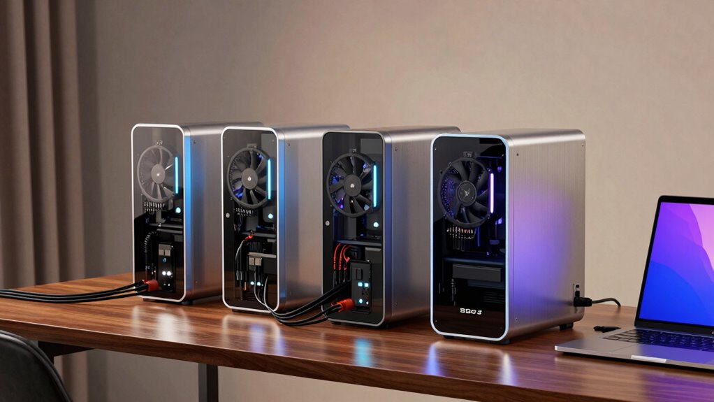 If you’re looking for the 14 best external GPU enclosures for Thunderbolt in 2026, I’ve got you covered. These enclosures support Thunderbolt 3 and 4, USB4, and high-powered GPUs from NVIDIA and AMD, offering great performance and portability. They also feature robust power supplies, multiple connectivity options, and compatibility with various operating systems. Want to find the perfect fit for your setup? Keep exploring to discover more about these top options.