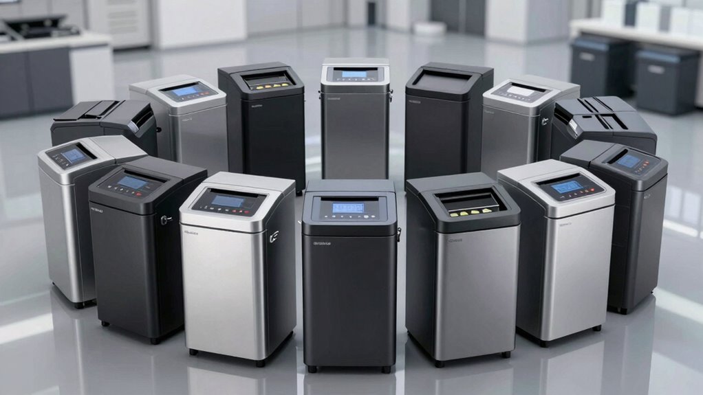 Selecting the appropriate security level for your heavy-duty shredder depends on how sensitive the documents and media you handle are. Security levels range from P-1 to P-7, with P-4 and above suited for confidential information. Micro-cut shredders at P-5 create tiny particles about 2x12mm, offering better confidentiality than cross-cut or strip-cut models. High-security shredders, typically P-4 or higher, can destroy credit cards, CDs, and other media, ensuring extensive data removal. The decision should match the document’s sensitivity; more confidential data demands higher security levels. Standards like DIN 66399 and NSA guidelines help determine particle size and shredding methods for each classification, guiding you to choose the right shredder to protect your information effectively.