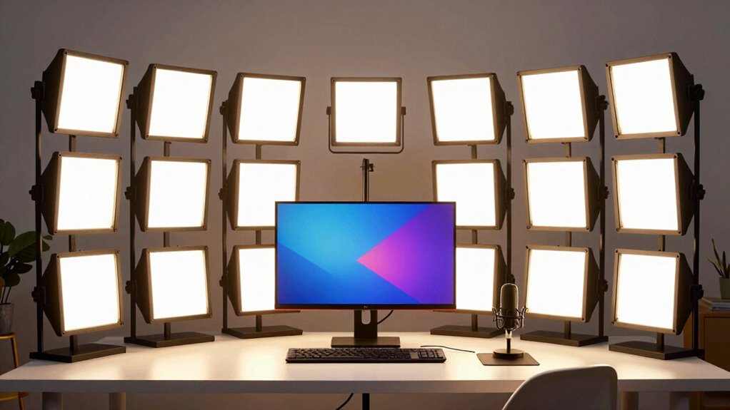 If you want a professional-looking stream in 2026, choosing the right key light is essential. I recommend considering options with high CRI ratings, adjustable brightness, and color temperature from 2900K to 7000K. Compact, flicker-free lights with app or remote control help create the perfect vibe. Whether you prefer RGB effects or simple softboxes, I’ll guide you through top choices that balance quality, flexibility, and cost so you can elevate your setup.
