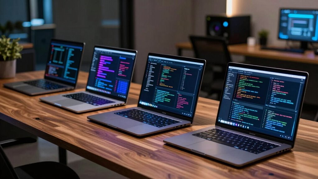 When selecting a laptop for cybersecurity, I focus on several key factors to make certain it meets my needs. I look at processing power, memory, and storage to handle demanding tasks, while security features help protect sensitive data. Additionally, I consider port options and display quality for ease of use and clarity during long sessions.