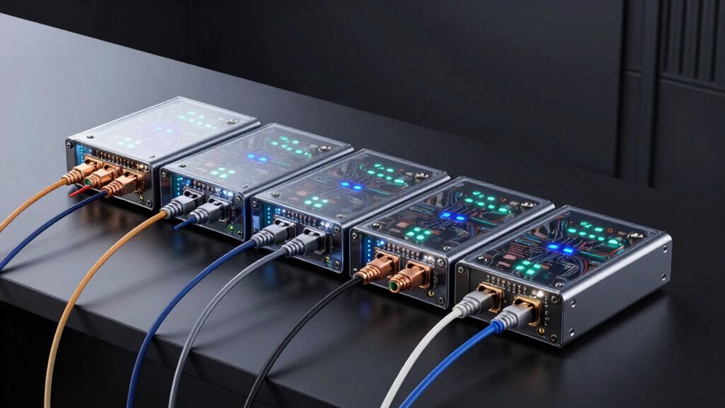 I make sure to keep my media converters clean and dust-free, regularly inspecting for any physical damage. I also update their firmware when updates are available to guarantee maximum performance and security. It’s important to check connections periodically, verify power supplies, and replace any worn-out cables or components promptly. By staying proactive with maintenance, I extend the lifespan of my media converters and keep my network running smoothly.