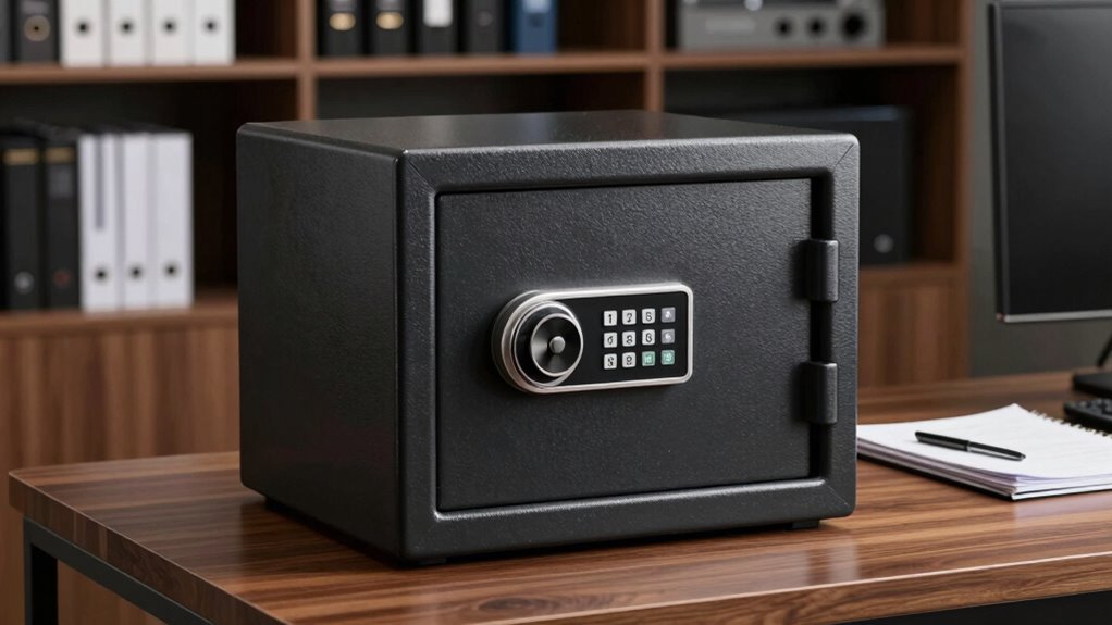 When choosing an office safe fireproof, I look at its fire resistance rating and waterproof features to protect valuables from multiple threats. I also consider the locking mechanisms and security features to guarantee only authorized access, along with the size and capacity to fit my needs. These factors help me pick a safe that offers reliable protection and fits seamlessly into my workspace.