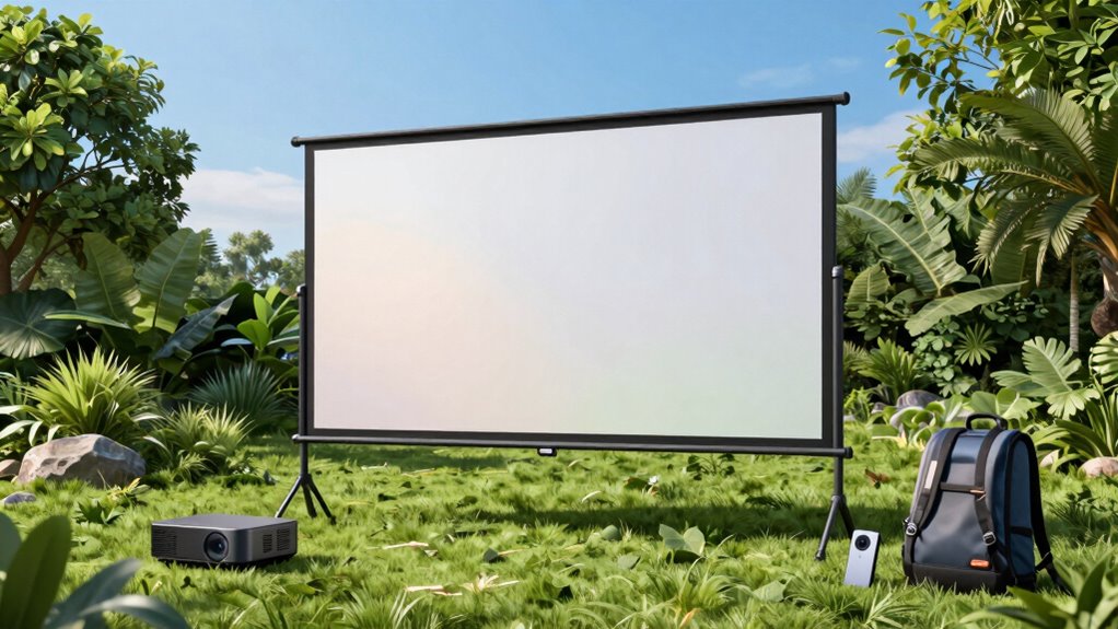 Selecting the appropriate screen size is crucial to guarantee your projection appears sharp and fills the viewing area properly. To do this, match the screen size to your environment’s available projection space, avoiding cropped images or empty gaps. Consider the aspect ratio—whether 16:9 or 4:3—to align with your projector’s native format for the best image quality. It’s also essential to choose a size that suits your audience and viewing distance; a larger screen benefits outdoor or big-group settings, while smaller screens work indoors. Additionally, ensure the screen’s size is compatible with your portable setup, so it’s easy to transport and assemble without hassle. Proper size selection guarantees an ideal viewing experience tailored to your specific use case.