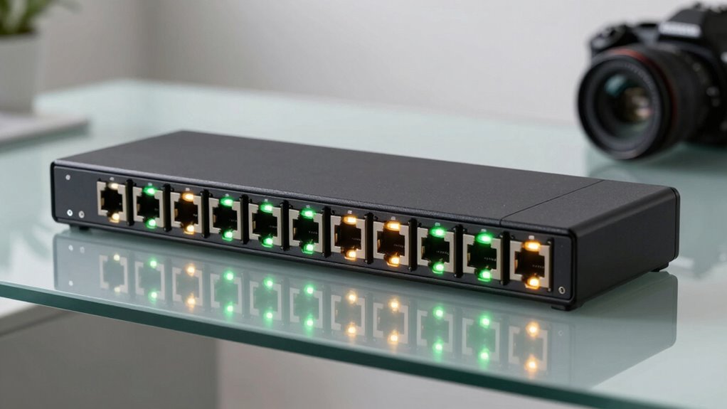 Selecting a silent managed switch for your office involves evaluating its management features and ease of use, especially if you or your staff aren’t network experts. User-friendly interfaces like web-based GUIs or mobile apps make configuration and monitoring straightforward, reducing setup time and errors. Features like VLAN setup, QoS prioritization, and port security give you better control over network traffic and security. Easy-to-navigate management software with clear menus and prompts simplifies maintenance, even for non-technical staff. Remote management capabilities via cloud or SNMP let you monitor and troubleshoot from anywhere, increasing convenience. Intuitive tools help maintain network stability and security without requiring extensive technical knowledge, making your network more reliable and easier to manage daily.