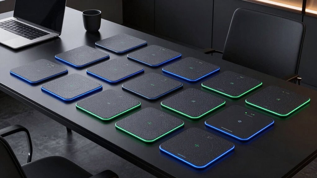 When selecting a smart desk mat with wireless charging, I consider factors like compatibility range, surface quality, and size to guarantee it fits my workspace. Durability and ease of maintenance are also key, along with any extra features that boost functionality. Keeping these points in mind helps me find a product that’s reliable and suits my needs perfectly.