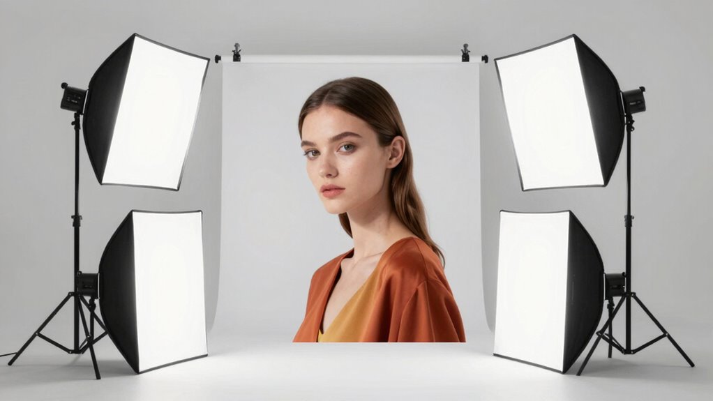 The ideal height for softbox lighting setups is typically around eye level or slightly above, depending on your subject and desired effect. I find that positioning the softboxes at this height creates soft, even illumination that reduces shadows and highlights facial features naturally. It’s essential to adjust height based on your photo’s purpose—whether portraits, product shots, or videos—to achieve professional, flattering results consistently.