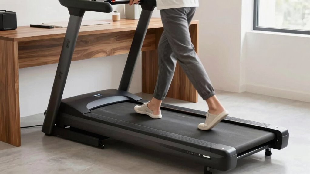 Adjustable speed and incline options are key features that can substantially enhance your workout experience with an under-desk treadmill. With speed ranges from 0.5 to 4.0 mph, you can walk, jog, or run based on your preference and fitness level. Multiple incline levels, usually between 5% and 12%, add variety and intensity, helping you burn more calories—up to 30% more than flat walking at the same speed. The ability to easily adjust speed and incline through remote controls or console buttons means you can make quick changes without disrupting your workflow. This precise control allows you to customize your workouts, whether you’re aiming for light movement or a more vigorous session, making your treadmill adaptable to your goals.