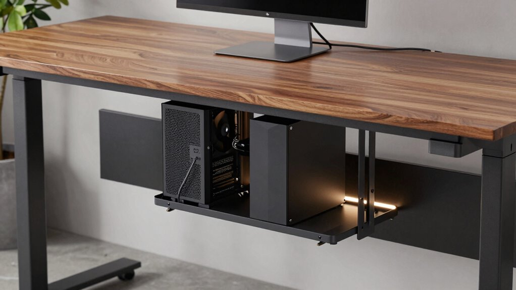Some of these mounts are perfect for gaming setups. Imagine your gaming rig suspended beneath your desk, freeing up space and keeping your hardware cool. I’ve found that certain models support heavier CPUs and offer adjustable features, making them ideal for high-performance gaming. Plus, they help create a clean aesthetic, so you can focus on your game without clutter. Trust me, you’ll love the difference it makes in your setup!