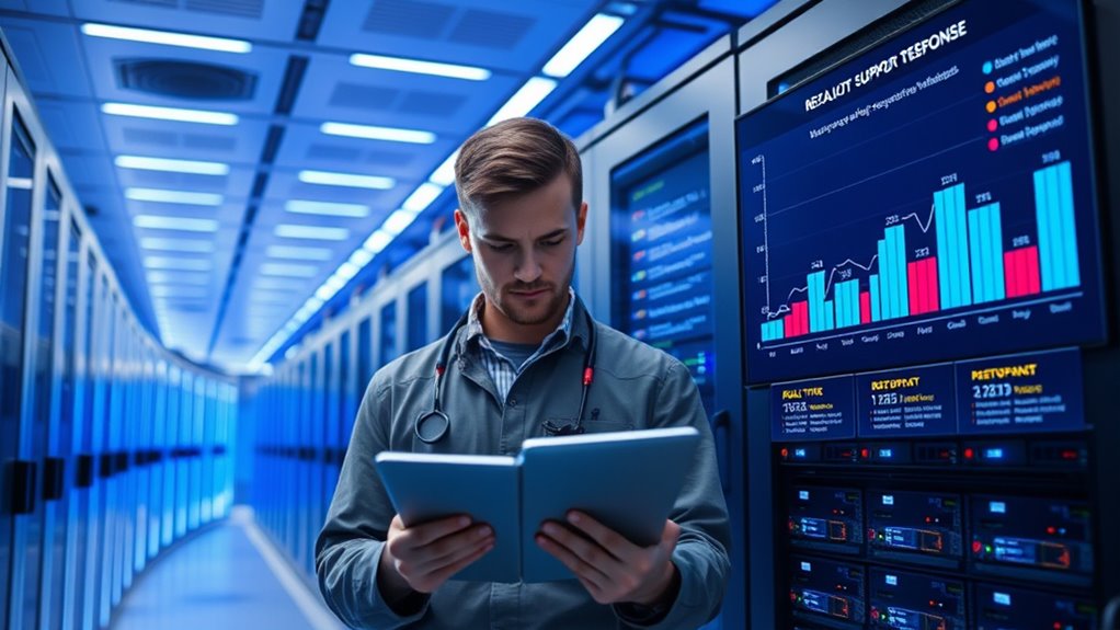 To improve support response times, you need effective tools that track real-time metrics and flag delays instantly. Monitoring these data points helps you identify patterns and address issues proactively before customers notice problems. By integrating monitoring systems with your support workflows, you can streamline responses and boost overall satisfaction. Additionally, understanding support response times can help you optimize resource allocation and prioritize urgent issues effectively. Implementing automated alerts ensures that your team responds swiftly to critical support tickets, reducing wait times and increasing customer trust.