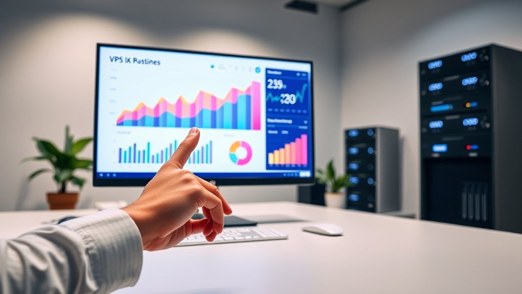 VPS hosting gives you complete control over your server environment, empowering you to customize settings and install software without restrictions. You gain root access, so you can manage file systems, user permissions, and run custom scripts tailored to your business needs. This control extends to network configurations and firewall rules, enabling you to implement specific security policies. You can select your preferred operating system—like Ubuntu, CentOS, or Debian—or upload custom images, streamlining deployment. One-click installs for software stacks such as LAMP or Docker simplify setup. You also have the flexibility to allocate resources—RAM, CPU, and storage—precisely to match your workload. Management interfaces like cPanel or Plesk make overseeing your server straightforward, while dedicated IP addresses and configurable firewalls enhance security and performance. Additionally, understanding contrast ratio can help optimize your display settings for better visual clarity during server management or presentations. Being aware of support hours can ensure timely assistance if issues arise, minimizing downtime and maintaining smooth operation. Moreover, implementing security best practices can further protect your server from potential threats and vulnerabilities.